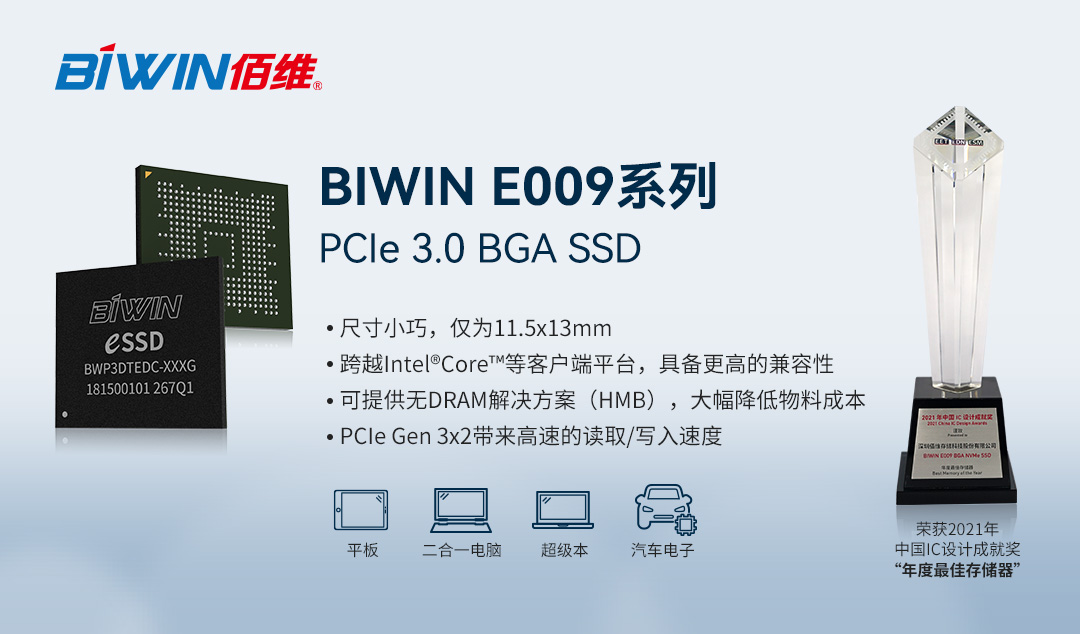 佰維立足“端”應(yīng)用存儲(chǔ)需求,在存儲(chǔ)介質(zhì)特性研究、核心固件算法、存儲(chǔ)器設(shè)計(jì)與仿真、存儲(chǔ)芯片封裝工藝、自研存儲(chǔ)芯片測(cè)試設(shè)備與算法等核心技術(shù)的支持下,打造了豐富的BGA SSD產(chǎn)品體系。比如公司推出的E009系列,順利通過(guò)Google Chromebook認(rèn)證,并榮獲"2021中國(guó)IC設(shè)計(jì)成就獎(jiǎng)年度最佳存儲(chǔ)器”大獎(jiǎng)。